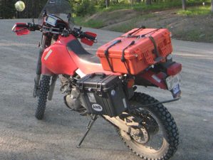 Meredith’s bike is a 2008 Yamaha WR 250R. We just purchased this bike last year, replacing her 2004 Kawasaki KLR 650. This new bike is lighter, and, therefore, is much more maneuverable at low speeds and easier overall for her to ride. Her bike is outfitted in the same manner as mine, with Pelican cases as panniers and a Pelican case on the back rack.